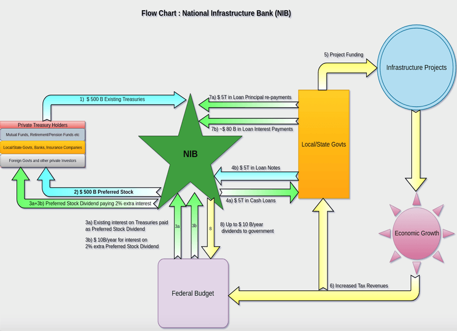How the National Infrastructure Bank will Lend – The NIB will operate the same as any commercial bank, because it will be chartered as a deposit-taking bank. Over time, the NIB will take in $500 billion in privately-held Treasuries as capital (an Asset), in exchange for an equal amount of preferred stock in the NIB (a Liability; see Flow Chart below). The NIB will maintain a prudential ratio of $1 in capital to every $10 in loans. The NIB won’t lend out its capital, but will keep it as a “rainy day fund” in case any loans can’t be repaid. The NIB will pay up to an extra 2% yield on the preferred stock (up to $10 billion per year, to be set by the NIB Board) as a premium to investors to entice their investments with the NIB. The premium will be financed out of the NIB’s interest earnings from the loans.