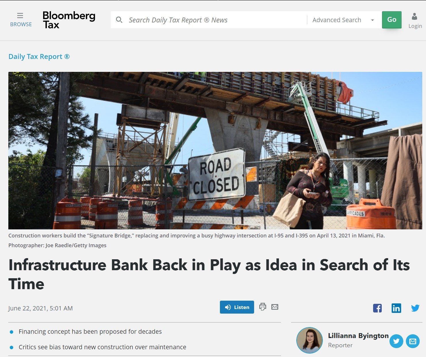 Bloomberg covers National Infrastructure Bank and HR3339 In Article On Infrastructure Funding Battle