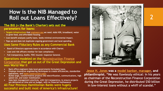 A: NIB infrastructure loans are approved by the bank’s Board of Directors in accordance with loan provisions set out in the legislation. The NIB uses the same fiduciary rules as any commercial bank. As a rule, 99% of infrastructure loans are expected to be repaid in full and on time, in particular because SLGMAs want to ensure a continued high bond rating. The NIB’s back-office engineers can assist jurisdictions in planning and expediting loans if needed, while NIB loan officers will check to ensure that projects remain on-time and on-budget. Two examples of successful public banks that operated this way include the 100-year-old Bank of North Dakota, still in existence and highly profitable, and the national Reconstruction Finance Corporation, which ended operations in 1957 after earning huge revenues for governments, with all loans repaid.[1] Here is how the NIB would be managed: