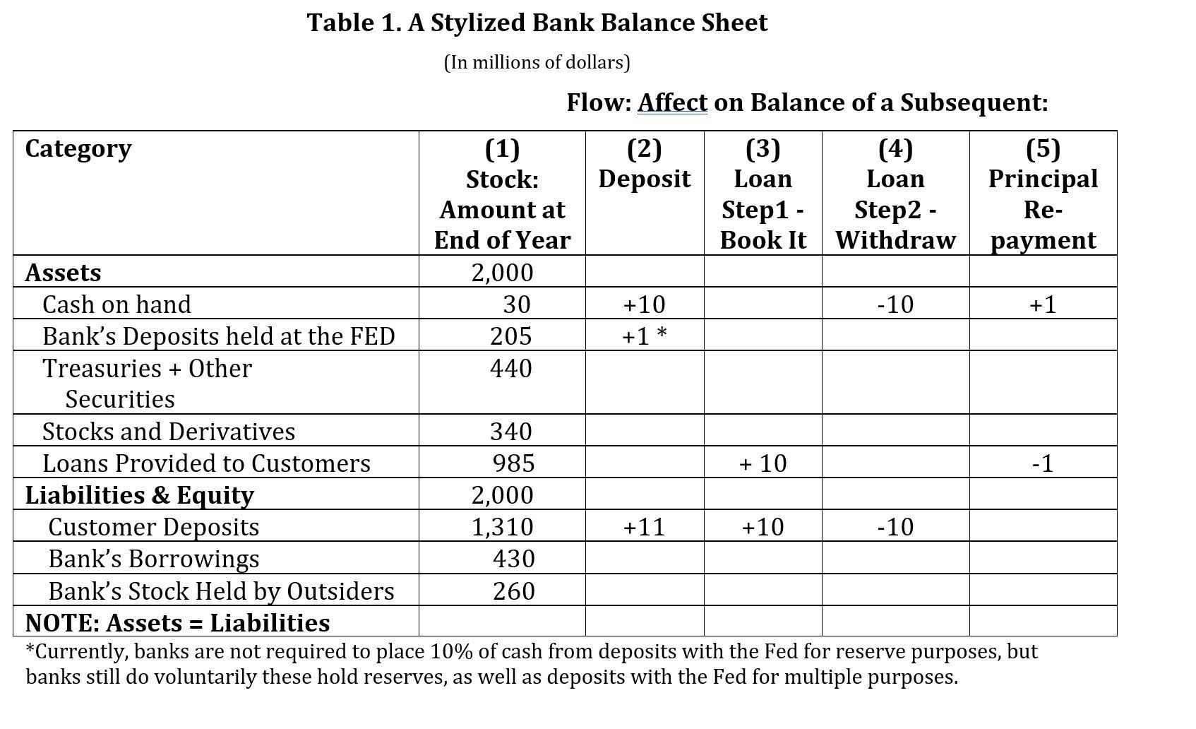 The reality is that all three theories on money creation are true at the same time. Table 1 shows the effects on a bank’s books of a customer’s deposit (column 2), booking a new loan that creates a deposit (column 3), withdrawing cash from that deposit that goes to another bank (column 4); and repaying principal on a loan (column 5). A controlled test of bank accounting software showed that when a loan is made, a cash deposit of the same amount in the borrower’s name, ready for use, is also made.1 Alan Holmes, a former senior vice president of the New York Federal Reserve Bank, wrote in 1969, “in the real world banks extend credit, creating deposits in the process, and look for the reserves later.”