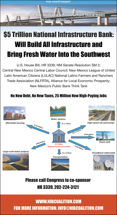 The Coalition for a National Infrastructure Bank (NIB) placed an ad in the Sunday, August 8, edition of the Santa Fe New Mexican, to further build support for HR 3339. The ad details how the $5 trillion NIB would build all the nation’s infrastructure, including bringing fresh water into the Southwest. This campaign will continue to promote the NIB as a supplement to the infrastructure bills in Washington that are currently being debated.
