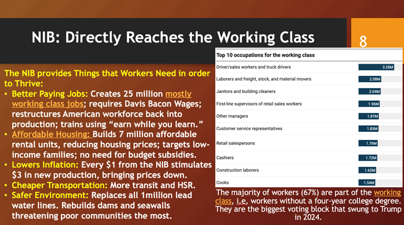 CONCLUSION: Clearly, an alternative, bolder policy is needed to lift the American worker. A National Infrastructure Bank will provide off-budget financing, as well as the organization to implement all of the projects that America needs. Moreover, $5 trillion in added infrastructure investment will create 25 million high wage jobs. The NIB’s construction of millions of new housing units will bring their prices down, improve worker’s pay so families can better afford housing, and provide internal cross financing by borrowing authorities to bridge the gap between market rates and what families can afford to pay. Once the NIB is enacted, it will be independent of budget cycles, although it will still complement Federal, state, and local investment programs. By comparison, any other economic policy which plans to raise spending through the Federal budget will likely stall due to the budget constraint. Therefore, the NIB is the only viable option to adequately reach and attract working class voters.